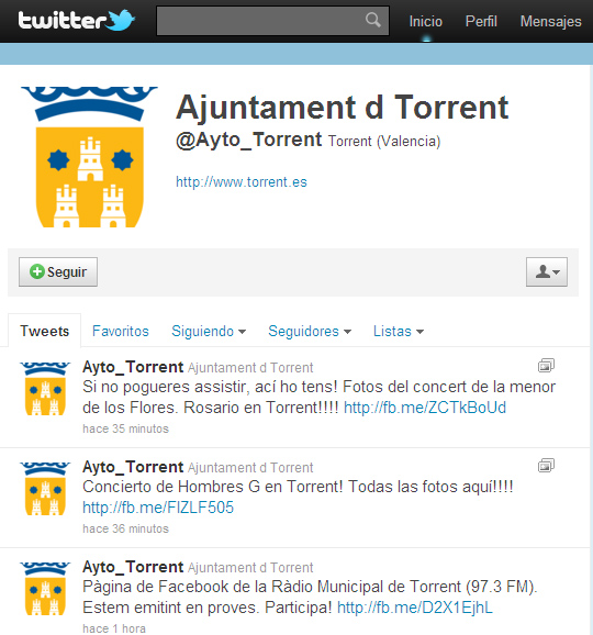 Los principales ayuntamientos de España, Madrid, Barcelona, Zaragoza o Sevilla u organismos autonómicos y provinciales como la Generalitat Valenciana o la Diputación de Valencia, ya utilizan Twitter para informar a sus seguidores, que en esta plataforma se les llama followers, de las novedades y noticias que generan. Se trata de una herramienta mucho más joven que Facebook, fue lanzada en julio de 2006 y la versión en español a penas tiene dos años de vida, quizá por este motivo está menos desarrollada por los ayuntamientos de la comarca.